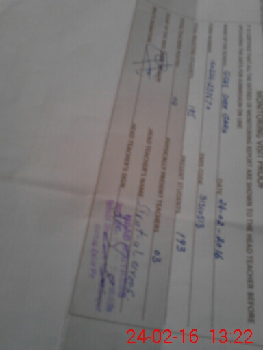 | School Visited by School Health & Nutrition Supervisor (No. of Visits) | 1 | Name1: | Irfan Mahmmood | Name2: | None |