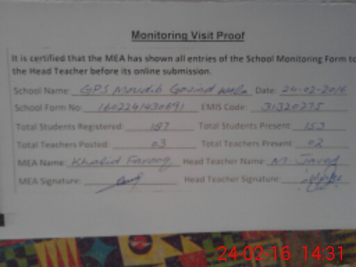 | EMIS Code: 31320275 | Name of School: GPS MOADIB GOVIND WALA | |||