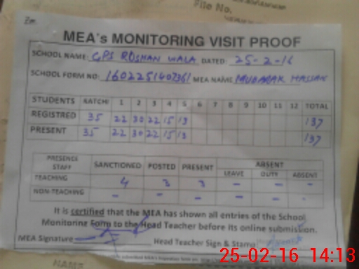 | Attendance Register | Head Teacher | MEA with School | Visit Proof |