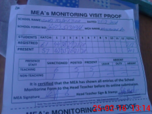 | Attendance Register | Head Teacher | MEA with School | Visit Proof |