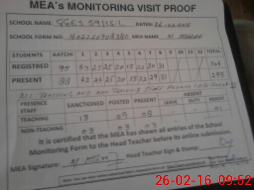 | Attendance Register | Head Teacher | MEA with School | Visit Proof |