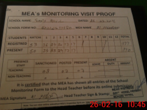 | Attendance Register | Head Teacher | MEA with School | Visit Proof |