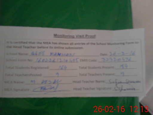 | Certified that this School was Inspected by the Undersigned MEA/DMO Today and the Information Stated Above is as Per Record. | |||||