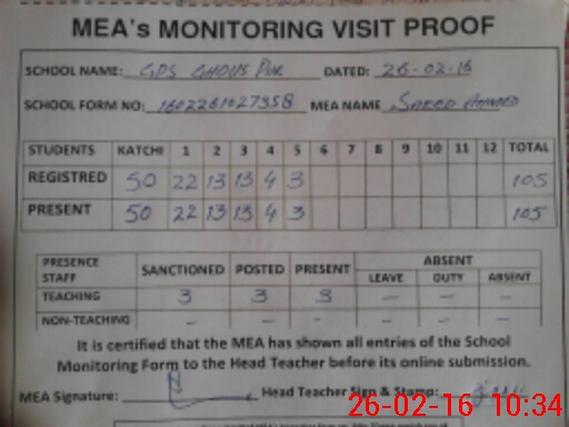 | Attendance Register | Head Teacher | MEA with School | Visit Proof |