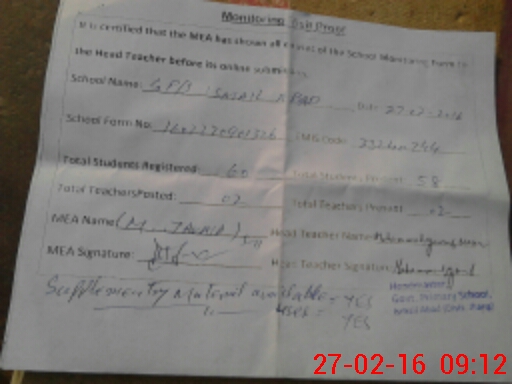 | Attendance Register | Head Teacher | MEA with School | Visit Proof |