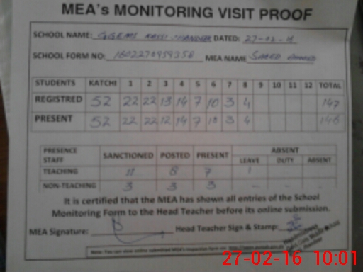 | Certified that this School was Inspected by the Undersigned MEA/DMO Today and the Information Stated Above is as Per Record. | |||||