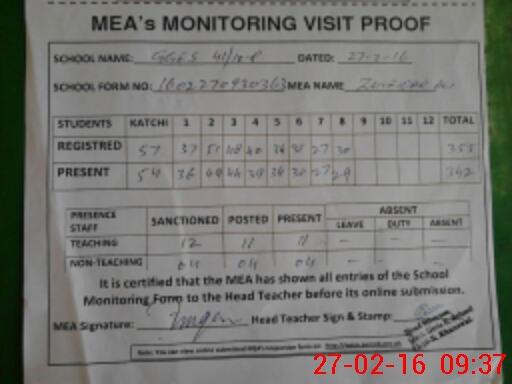 | Attendance Register | Head Teacher | MEA with School | Visit Proof |