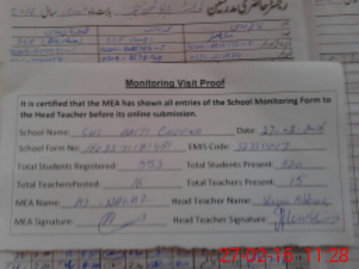 | Attendance Register | Head Teacher | MEA with School | Visit Proof |