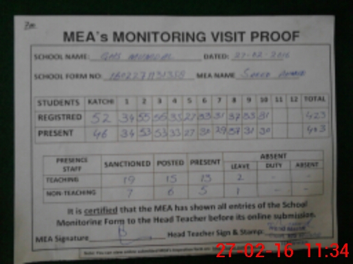 | Attendance Register | Head Teacher | MEA with School | Visit Proof |
