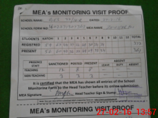 | Attendance Register | Head Teacher | MEA with School | Visit Proof |