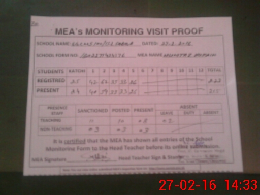 | Attendance Register | Head Teacher | MEA with School | Visit Proof |