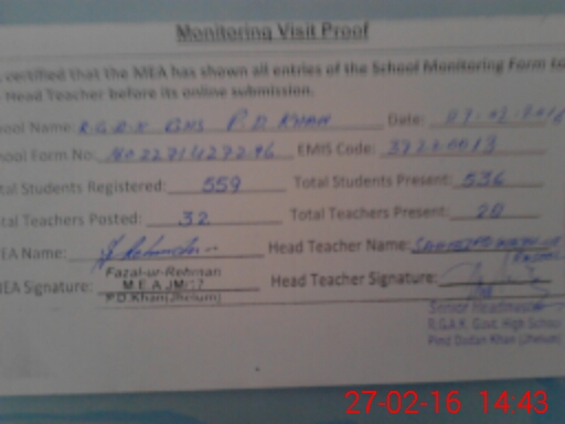 | EMIS Code: 37220013 | Name of School: GHS RGAK PIND DADAN KHAN | |||