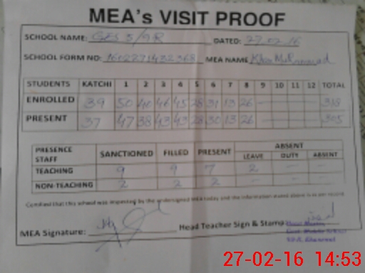 | Attendance Register | Head Teacher | MEA with School | Visit Proof |
