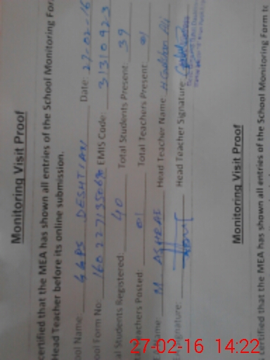 | Attendance Register | Head Teacher | MEA with School | Visit Proof |