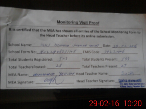 | School Visited by School Health & Nutrition Supervisor (No. of Visits) | 1 | Name1: | M Usman Talib | Name2: | |