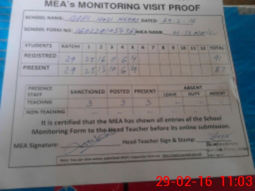 | Attendance Register | Head Teacher | MEA with School | Visit Proof |
