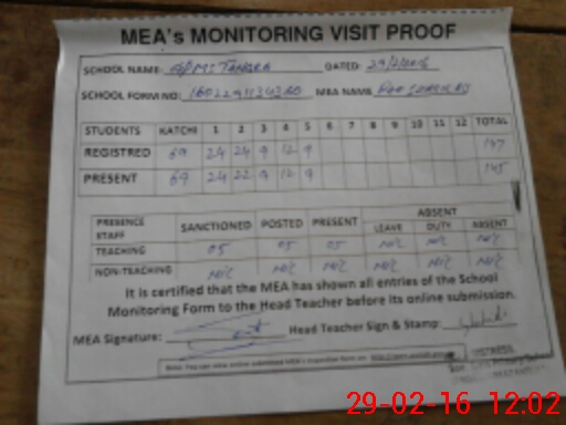 | Attendance Register | Head Teacher | MEA with School | Visit Proof |