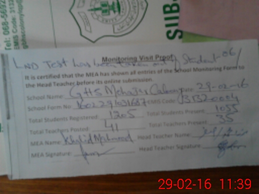 | Certified that this School was Inspected by the Undersigned MEA/DMO Today and the Information Stated Above is as Per Record. | |||||
