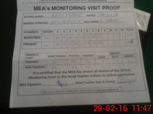 | Attendance Register | Head Teacher | MEA with School | Visit Proof |