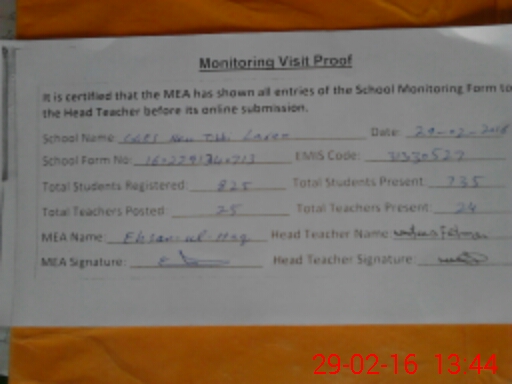 | Certified that this School was Inspected by the Undersigned MEA/DMO Today and the Information Stated Above is as Per Record. | |||||