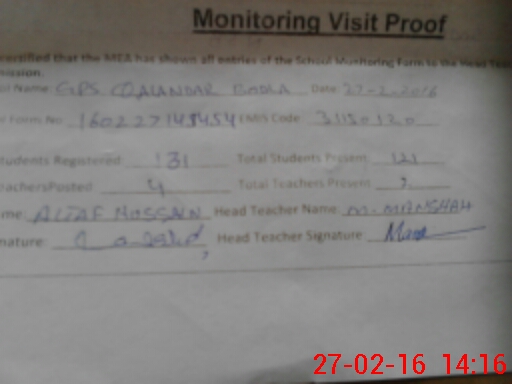 | Attendance Register | Head Teacher | MEA with School | Visit Proof |