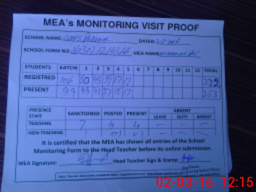 | Attendance Register | Head Teacher | MEA with School | Visit Proof |