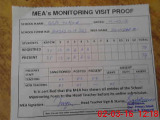 | Attendance Register | Head Teacher | MEA with School | Visit Proof |