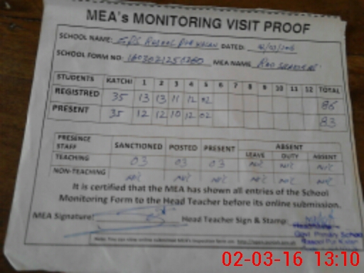 | Attendance Register | Head Teacher | MEA with School | Visit Proof |