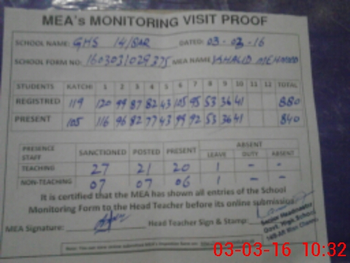 | Certified that this School was Inspected by the Undersigned MEA/DMO Today and the Information Stated Above is as Per Record. | |||||