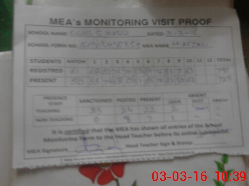 | Attendance Register | Head Teacher | MEA with School | Visit Proof |