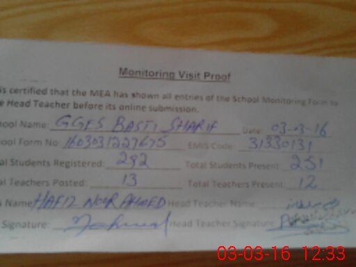 | School Visited by School Health & Nutrition Supervisor (No. of Visits) | 1 | Name1: | Zeeshan Aslam | Name2: | Null |