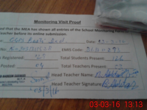 | EMIS Code: 36120293 | Name of School: GGPS BASTI DAD SHUJABAD MULTAN | |||