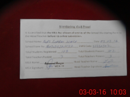 | Attendance Register | Head Teacher | MEA with School | Visit Proof |