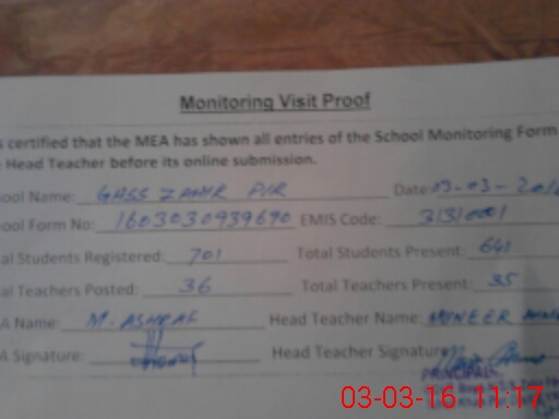 | EMIS Code: 31310001 | Name of School: GHSS ZAHIR PEER | |||