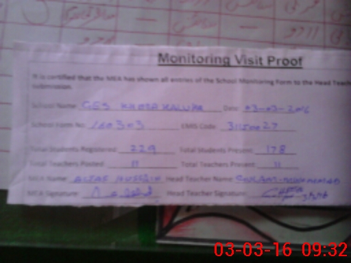 | Attendance Register | Head Teacher | MEA with School | Visit Proof |