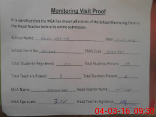 | Attendance Register | Head Teacher | MEA with School | Visit Proof |