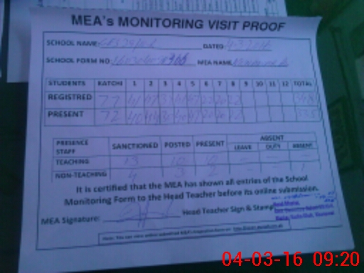 | Attendance Register | Head Teacher | MEA with School | Visit Proof |