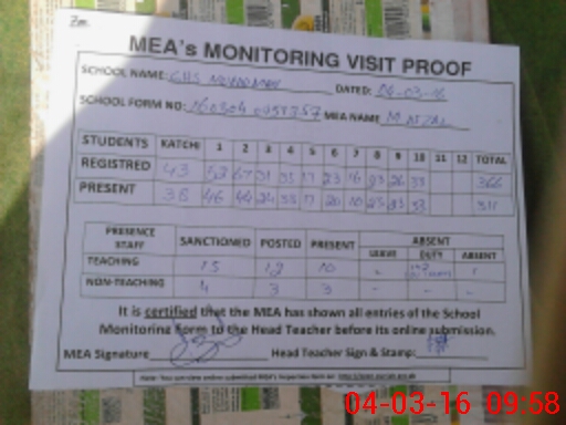 | Attendance Register | Head Teacher | MEA with School | Visit Proof |