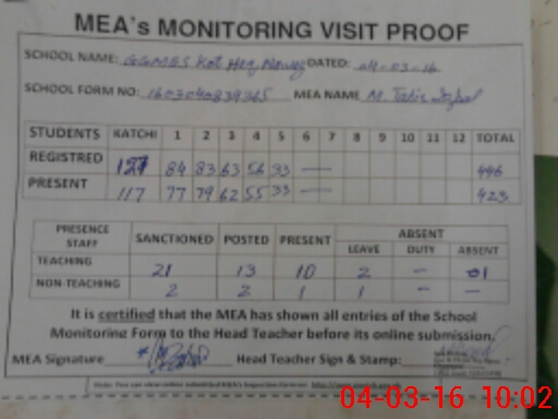 | Attendance Register | Head Teacher | MEA with School | Visit Proof |