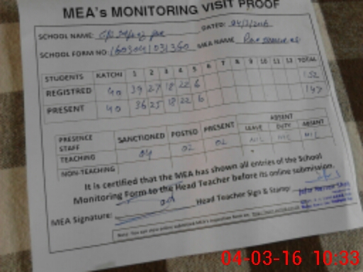 | Attendance Register | Head Teacher | MEA with School | Visit Proof |