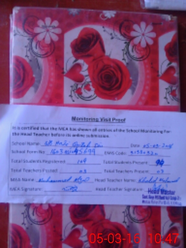 | Attendance Register | Head Teacher | MEA with School | Visit Proof |