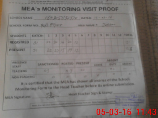 | Attendance Register | Head Teacher | MEA with School | Visit Proof |