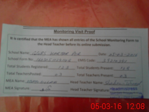 | Attendance Register | Head Teacher | MEA with School | Visit Proof |