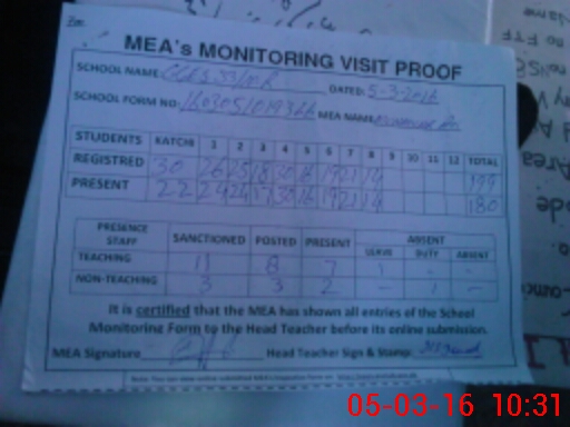| Attendance Register | Head Teacher | MEA with School | Visit Proof |