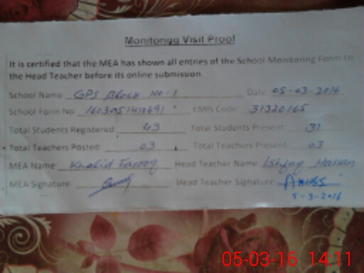 | EMIS Code: 31320162 | Name of School: GPS BLOCK NO. 1 ALLAH ABAD | |||