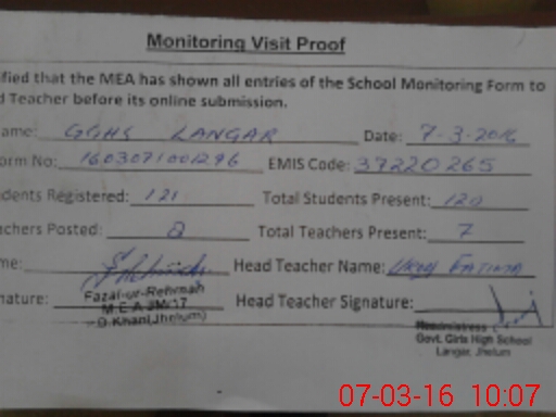 | Certified that this School was Inspected by the Undersigned MEA/DMO Today and the Information Stated Above is as Per Record. | |||||