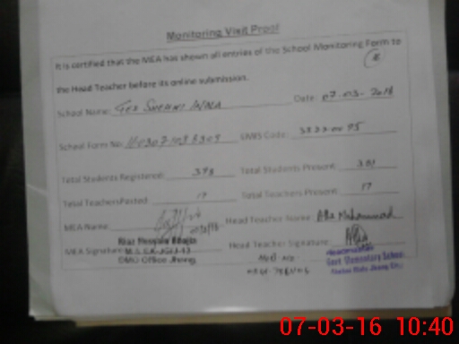 | Attendance Register | Head Teacher | MEA with School | Visit Proof |