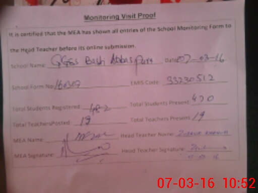 | Certified that this School was Inspected by the Undersigned MEA/DMO Today and the Information Stated Above is as Per Record. | |||||