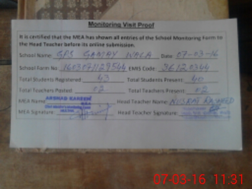 | EMIS Code: 36120344 | Name of School: GPS GAMAY WALA ADDA PIR GHAIB P/O NASEERPUR | |||