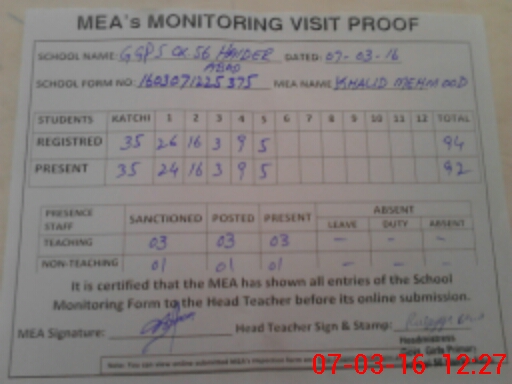 | Attendance Register | Head Teacher | MEA with School | Visit Proof |